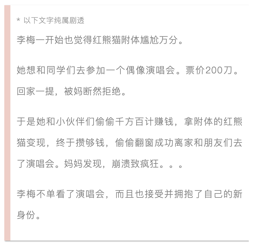李梅是在和妈妈的不断斗争中有机会享受“熊猫附体”带来的好处,在此过程中,她和妈妈的连结越来越弱,和朋友们的连结越来越强。