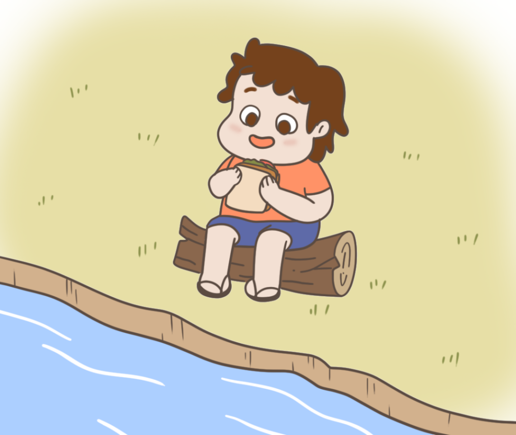 我坐到一根圆木上,一边打开一包三明治,一边欣赏着周围险峻的山景,和眼前流淌的小河。